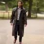 Possui capuz removível, capa removível, cordão na cintura, dois bolsos de fole com abas presas por botões de pressão, dois bolsos para aquecer as mãos, zíper de plástico bidirecional, gola de veludo cotelê de algodão, alças para as pernas, punhos ajustáveis e abertura central nas costas.