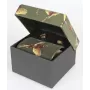 A caixa contém um par de abotoaduras e uma gravata de seda combinando